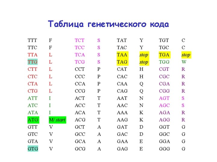 Генетический код: старт-кодоны TTT TTC TTA TTG CTT CTC CTA CTG ATT ATC ATA ATG GTT GTC GTA GTG F F L L L I I I M/ start V V TCT TCC TCA TCG CCT CCC CCA CCG ACT ACC ACA ACG GCT GCC GCA GCG S S P P T T A A TAT TAC TAA TAG CAT CAC CAA CAG AAT AAC AAA AAG GАT GАC GАA GАG Y Y stop H H Q Q N N K K D D E E TGT TGC TGA TGG CGT CGC CGA CGG AGT AGC AGA AGG GGT GGC GGA GGG C C stop W R R S S R R G G