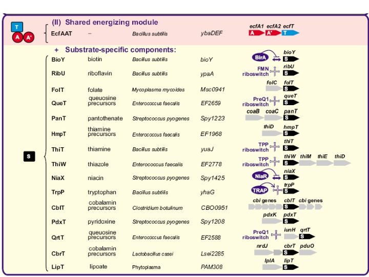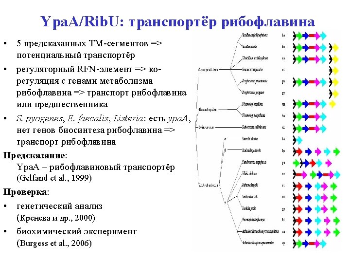 Ypa. A: riboflavin transporter • 5 predicted TM segments => a transporter • Upstream RFN element => co-regulation with riboflavin genes => transport of riboflavin / precursor • S. pyogenes, E. faecalis, Listeria spp. : ypa. A, no riboflavin pathway => transport of riboflavin Prediction: Ypa. A is riboflavin transporter (Gelfand et al. , 1999) Verification: • by genetic analysis (Kreneva et al. , 2000) • directly (Burgess et al. , 2006) => Rib. U • • ypa. A is regulated by riboflavin (Lee et al. , 2001) … via attenuation of transcription (Winkler et al. , 2003)