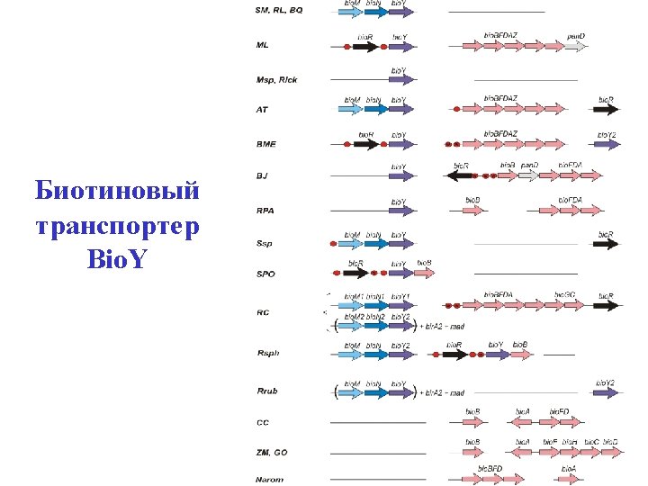 Biotin transporter Bio. Y • Identification: – co-localization – co-regulation – phylogenetic profiling • Additional components – ATPase(? ) bio. M – Permease(? ) bio. N