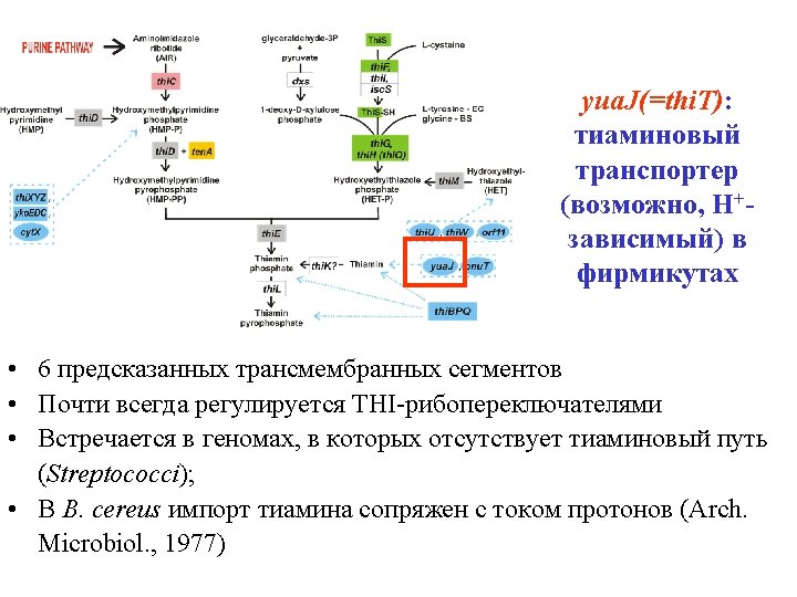 yua. J(=thi. T): thiamine transporter • 6 predicted TM-segments • Regulated by THI riboswitches • Streptococci: Thi. T, no thiamine pathway