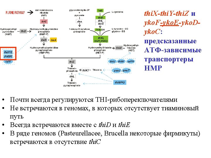 yko. FEDC: ATP-dependent HMP transporter • • Regulated by THI riboswitches Newer occurs in genomes lacking thiamine pathway Always co-occurs with thi. D and thi. E Sometimes occurs without thi. C