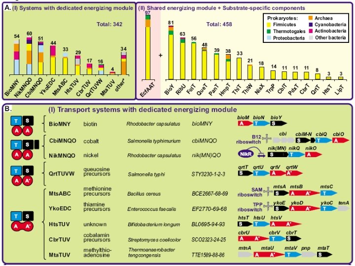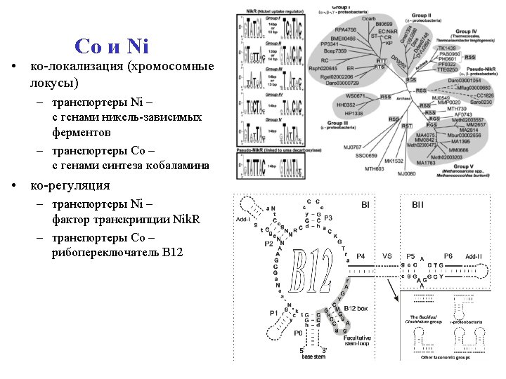 Cobalt and Nickel • Co-localization – Ni transporters with genes for Nidependent enzymes – Co transporters with cobalamine biosynthesis genes • Co-regulation – Ni transporters by transcription factor Nik. R – Co transporters by В 12 riboswitich