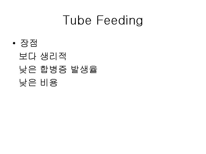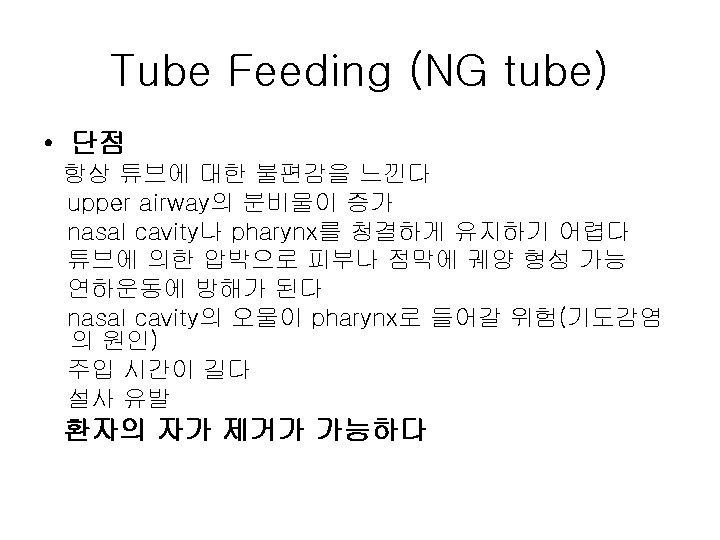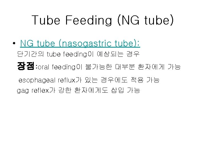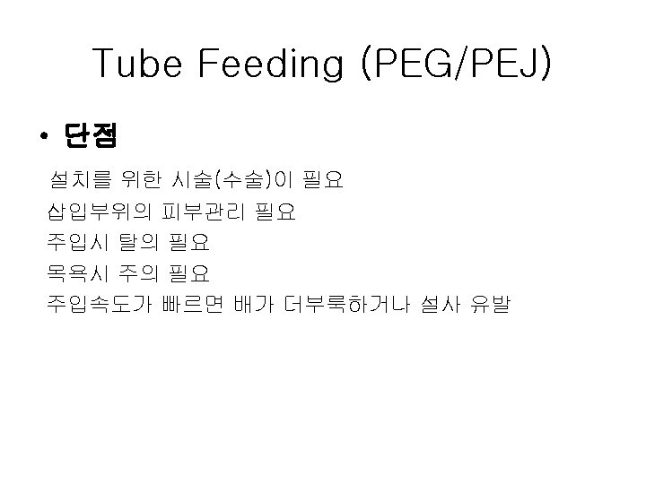 Tube Feeding (PEG/PEJ) • PEG (Percutaneous endoscopic gastrostomy): aspiration의 위험이 적은 경우 esophageal reflux가 없고 stomach의 기능이 정상인 경우 장기간의 tube feeding이 예상되는 경우 NG tube 삽입이 어려운 경우 • PEJ (Percutaneous Endoscopic Jejunostomy): esophageal reflux가 있는 경우 gastrostomy가 어려운 경우