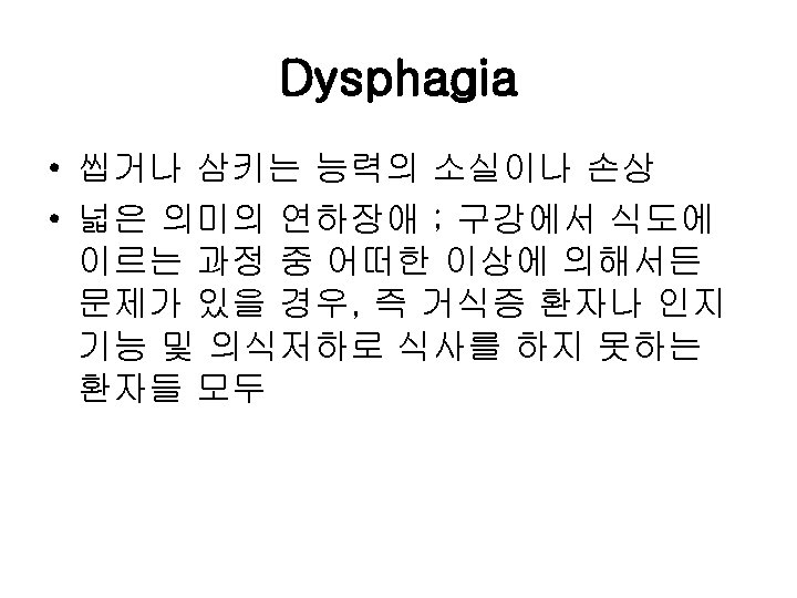 Feeding for dysphagia • Oral feeding: 일반 식이 • Oral feeding: 연하곤란식 1~4단계 • Tube feeding: NG tube PEG/PEJ OE tube • Intravenous nutrition