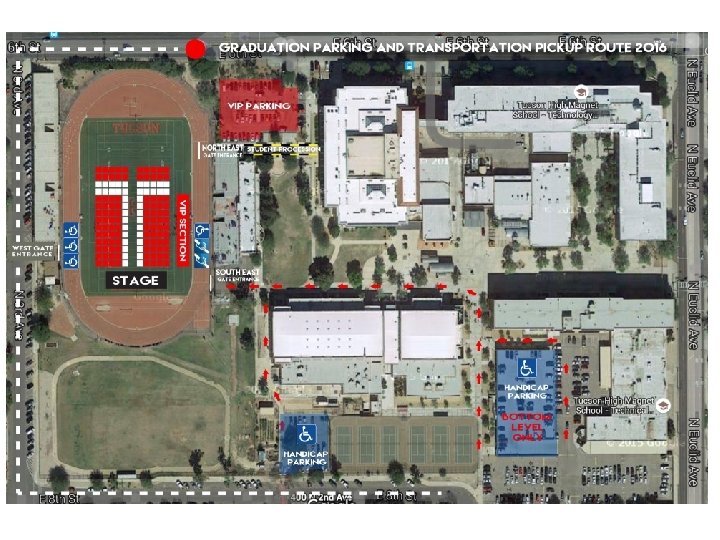 Parking Information • Additional parking will be available at the District Office at 1010 E. 10 th Street. This lot is located directly north of the district offices. Tucson Unified School District’s transportation department will provide shuttle service from the parking lot to Tucson High Magnet School. The shuttles will run from 4: 30 to 6: 40 p. m. , at five minute intervals. The shuttle service will continue at five minute intervals for one hour after the ceremony. • The University of Arizona will allow the use of all surface parking after 5: 00 p. m. on Graduation Day. Please observe all UA parking regulations ( e. g. handicapped parking and official parking spaces). There will be shuttle services from the UA surface lots ( see attached map).