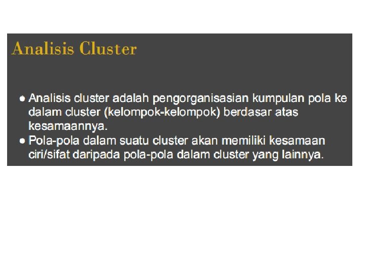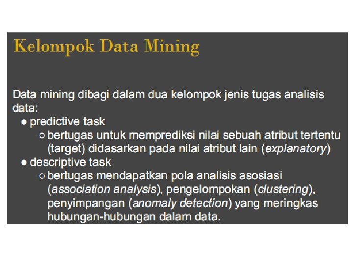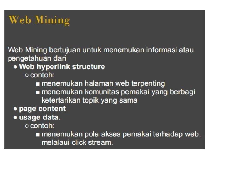 IR dari Koleksi Dokumen Teks Kategori utama dari metode: – Ranking kemiripan terhadap query (vector space model). – Pencocokan exact (Boolean). – Ranking berdasarkan tingkat kepentingan dokumen (Page. Rank) – Kombinasi beberapa metode Contoh: Web search engine, seperti Google & Yahoo, menggunakan metode kombinasi, berdasarkan pada pendekatan pertama dan ketiga, dengan kombinasi exact dipilih menggunakan machine learning