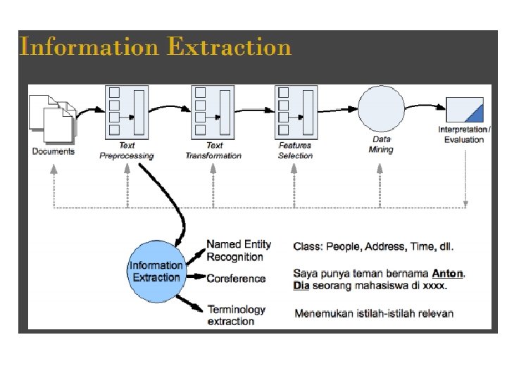 Information Retrieval (IR) • Secara teknis: indexing (pembuatan index) dan retrieval (pencarian keterangan) dokumen textual. • Pencarian halaman pada WWW adalah aplikasi paling “ngetop” saat ini • Fokus pertama: meretrieve dokumen yang relevan dengan query. • Fokus kedua: meretrieve himpunan besar dokumen secara efisien.