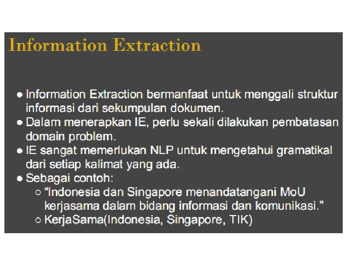 Contoh Sistem IR Conventional (katalog perpustakaan) Pencarian dengan kata kunci, judul, penulis, dll. Text-based (Google, Yahoo, ASK). Pencarian dengan kata kunci (keyword). Pencarian terbatas menggunakan query dalam bahasa alami. Multimedia (QBIC, Web. Seek, Sa. Fe) Pencarian dengan penampilan visual (bentuk, warna, …) Sistem jawaban pertanyaan (Ask. Jeeves, Answerbus) Pencarian dalam bahasa alami (terbatas) Lainnya: IR lintas-bahasa, music retrieval