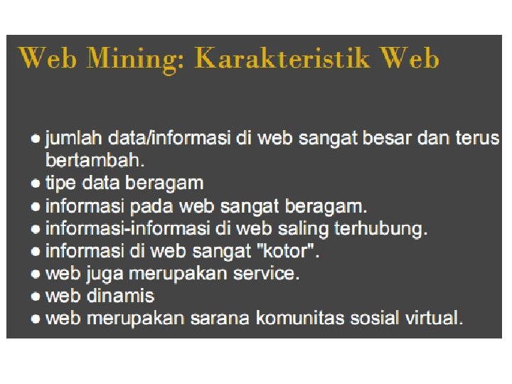 Kebutuhan IR WWW: lebih 25 milyar halaman web, 1. 3 milyar gambar dan lebih 1 milyar pesan Usenet yang diindeks pada Google (2006) Berbagai kebutuhan informasi: – Mencari dokumen yang masuk dalam topik tertentu – Mencari suatu informasi spesifik – Mencari jawaban dari suatu pertanyaan – Mencari informasi dalam bahasa berbeda –. . .