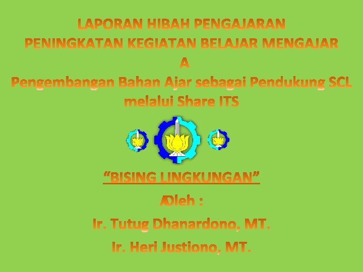 TUJUAN DAN MANFAAT • Menyediakan modul ajar BISING LINGKUNGAN yang dapat diakses melalui internet baik dari dalam kampus maupun luar kampus ITS. • Memberi dorongan kepada mahasiswa untuk selalu menggunakan media Internet dalam mempelajari mata kuliah BISING LINGKUNGAN. • Adanya modul ajar ini akan memberikan kemudahan dan semangat mahasiswa untuk mempelajari mata kuliah BISING LINGKUNGAN, sehingga mendorong mahasiswa untuk mendapat nilai bagus dan dengan demikian nilai rata – rata kelas akan naik dan meningkatkan prosentase kelulusan mata kuliah