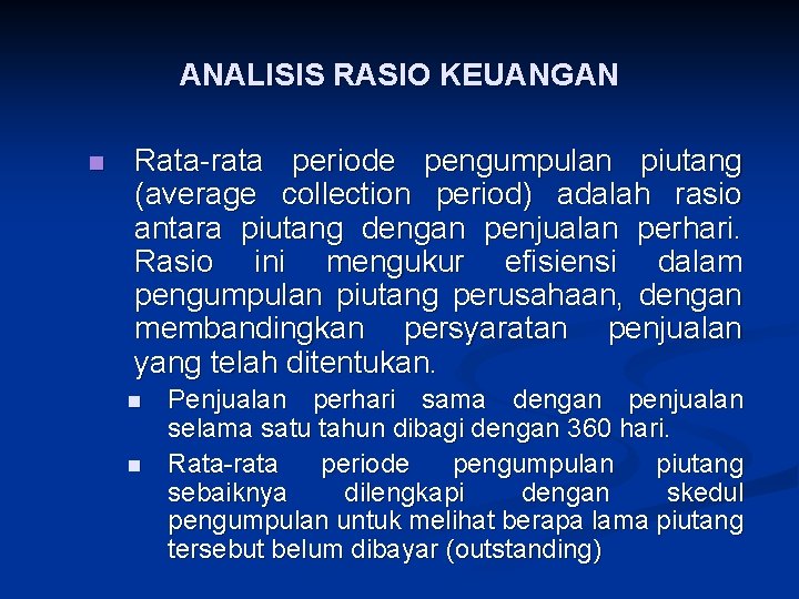 ANALISIS RASIO KEUANGAN n Rata-rata periode pengumpulan piutang (average collection period) adalah rasio antara piutang dengan penjualan perhari. Rasio ini mengukur efisiensi dalam pengumpulan piutang perusahaan, dengan membandingkan persyaratan penjualan yang telah ditentukan. n n Penjualan perhari sama dengan penjualan selama satu tahun dibagi dengan 360 hari. Rata-rata periode pengumpulan piutang sebaiknya dilengkapi dengan skedul pengumpulan untuk melihat berapa lama piutang tersebut belum dibayar (outstanding)