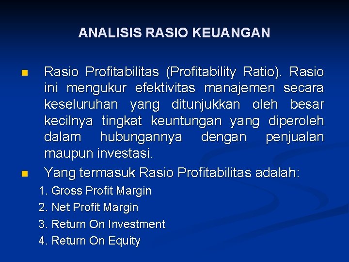 ANALISIS RASIO KEUANGAN n n Rasio Profitabilitas (Profitability Ratio). Rasio ini mengukur efektivitas manajemen secara keseluruhan yang ditunjukkan oleh besar kecilnya tingkat keuntungan yang diperoleh dalam hubungannya dengan penjualan maupun investasi. Yang termasuk Rasio Profitabilitas adalah: 1. Gross Profit Margin 2. Net Profit Margin 3. Return On Investment 4. Return On Equity