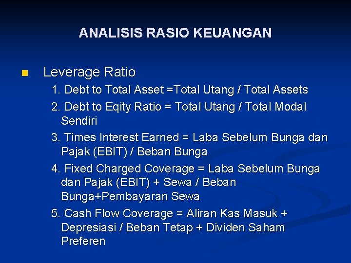 ANALISIS RASIO KEUANGAN n Leverage Ratio 1. Debt to Total Asset =Total Utang / Total Assets 2. Debt to Eqity Ratio = Total Utang / Total Modal Sendiri 3. Times Interest Earned = Laba Sebelum Bunga dan Pajak (EBIT) / Beban Bunga 4. Fixed Charged Coverage = Laba Sebelum Bunga dan Pajak (EBIT) + Sewa / Beban Bunga+Pembayaran Sewa 5. Cash Flow Coverage = Aliran Kas Masuk + Depresiasi / Beban Tetap + Dividen Saham Preferen