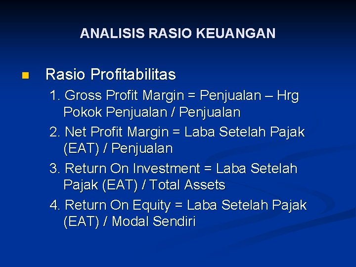 ANALISIS RASIO KEUANGAN n Rasio Profitabilitas 1. Gross Profit Margin = Penjualan – Hrg Pokok Penjualan / Penjualan 2. Net Profit Margin = Laba Setelah Pajak (EAT) / Penjualan 3. Return On Investment = Laba Setelah Pajak (EAT) / Total Assets 4. Return On Equity = Laba Setelah Pajak (EAT) / Modal Sendiri