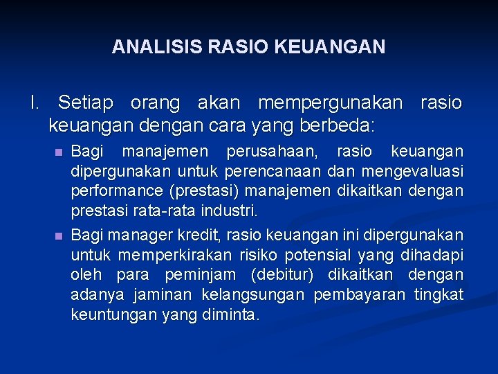 ANALISIS RASIO KEUANGAN I. Setiap orang akan mempergunakan rasio keuangan dengan cara yang berbeda: n n Bagi manajemen perusahaan, rasio keuangan dipergunakan untuk perencanaan dan mengevaluasi performance (prestasi) manajemen dikaitkan dengan prestasi rata-rata industri. Bagi manager kredit, rasio keuangan ini dipergunakan untuk memperkirakan risiko potensial yang dihadapi oleh para peminjam (debitur) dikaitkan dengan adanya jaminan kelangsungan pembayaran tingkat keuntungan yang diminta.