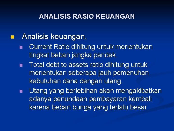 ANALISIS RASIO KEUANGAN n Analisis keuangan. n n n Current Ratio dihitung untuk menentukan tingkat beban jangka pendek. Total debt to assets ratio dihitung untuk menentukan seberapa jauh pemenuhan kebutuhan dana dengan utang. Utang yang berlebihan akan mengakibatkan adanya penundaan pembayaran kembali karena beban bunga yang terlalu besar