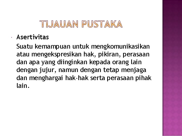 Asertivitas Suatu kemampuan untuk mengkomunikasikan atau mengekspresikan hak, pikiran, perasaan dan apa yang diinginkan kepada orang lain dengan jujur, namun dengan tetap menjaga dan menghargai hak-hak serta perasaan pihak lain.