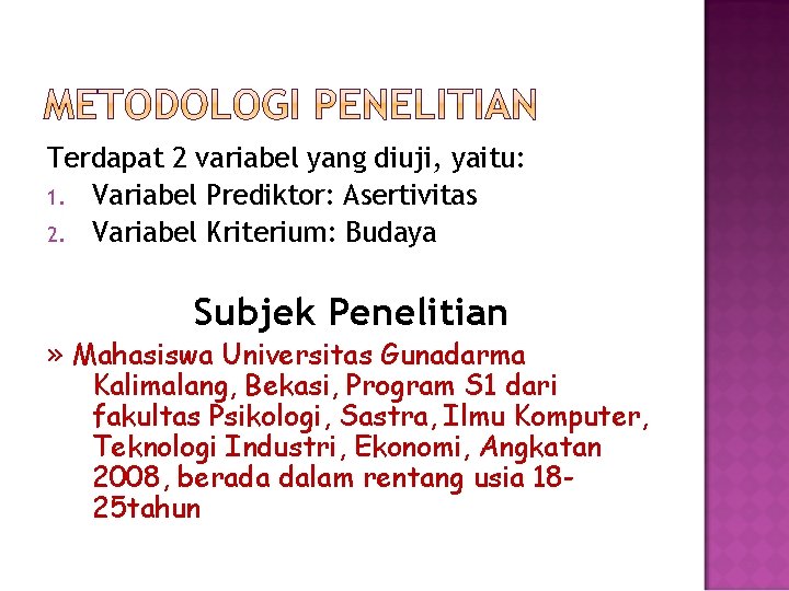 Terdapat 2 variabel yang diuji, yaitu: 1. Variabel Prediktor: Asertivitas 2. Variabel Kriterium: Budaya Subjek Penelitian » Mahasiswa Universitas Gunadarma Kalimalang, Bekasi, Program S 1 dari fakultas Psikologi, Sastra, Ilmu Komputer, Teknologi Industri, Ekonomi, Angkatan 2008, berada dalam rentang usia 1825 tahun