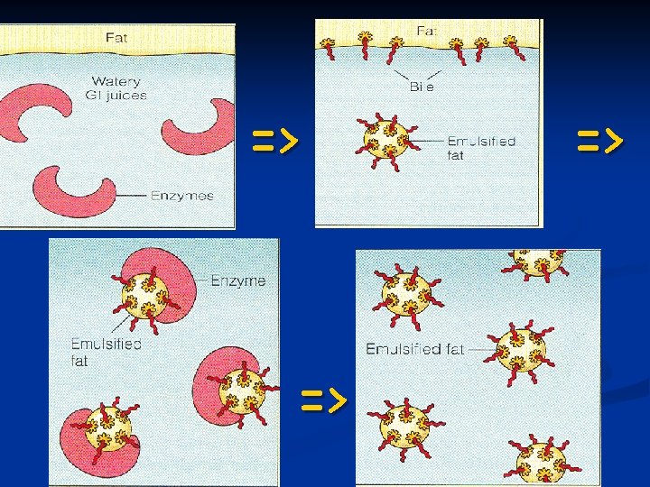 Trávení tuků n Emulgace tuků a tvorba micel n n n Místo: duodenum Účel: zvětšení povrchu tukových částic, rozpouštějí a tím zlepšení působení enzymů, umožnění vstřebávání Složení micel: n n Soli žlučových kyselin, monoacylglyceroly, lecitin, cholesterol, vitaminy rozpustné v tucích Polární oblast na povrchu molekuly X nepolární uvnitř ( hydrofóbní) n =› kapénky 200 -5000 nm v průměru Mechanická emulgace tuků – motilita žaludku => malé kapičky tuku 1 - 2 μm Emulgaci podporuje: lehce zásadité p. H n kyselé p. H: separace tuků