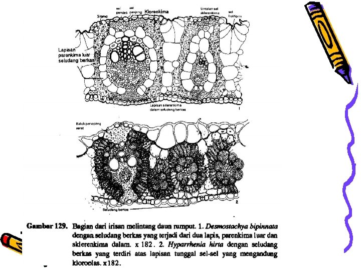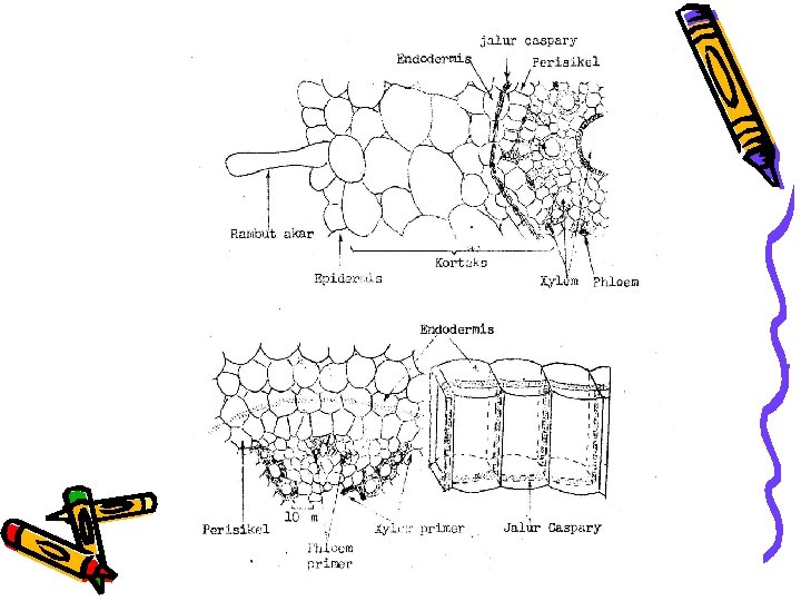 Pada akar air Bulu 2 akar & epidermis Sel 2 kortek Sel peresap/sel penerus endodermis yg tdk mengalmi penebalan perisikel Xylem akar