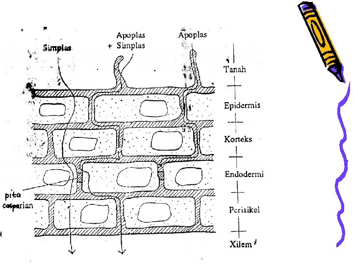 Transport air yg tlh diserap akar 1. T. ekstra vaskuler (tdk melalui jar. Pengangkut. Dibedakan arus simplas (melalui plasma sel) & arus apoplas (melalui ddn sel & ruang antar sel) 2. T. intra vaskuler (melalui jar pengangkut), xilem akar --- xilem batang ---batang (perenkim xilem/jari 2 empulur --- kortek batang
