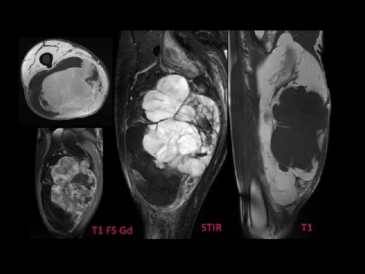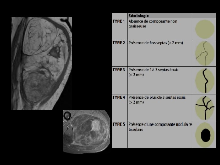 IRM • Tumeur graisseuse en hypersignal T 1 et. T 2. • Homogène: jeune enfant T 2 FS Tumeurs homogène contenant quelques septas T 1 • Hétérogène: nourrisson composante myxoïde non graisseuse+ PDC des zones myxoïdes (*) et des septa (flèche). T 1 FS Gd