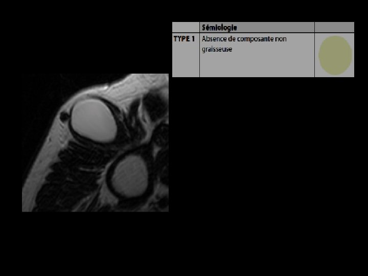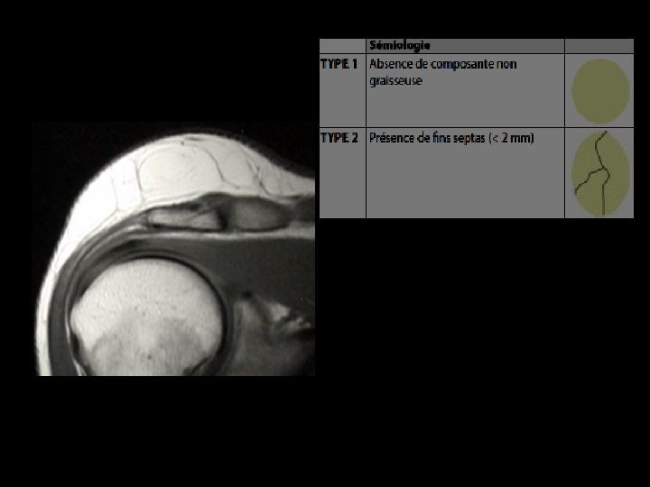 IRM: • Aspect tout à fait comparable à celui de la graisse souscutanée • Lésion homogène, hyperintense en pondération T 1 et T 2 • Séquences avec suppression du signal de la graisse : lésion hypointense