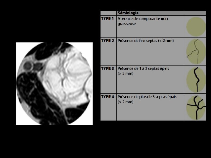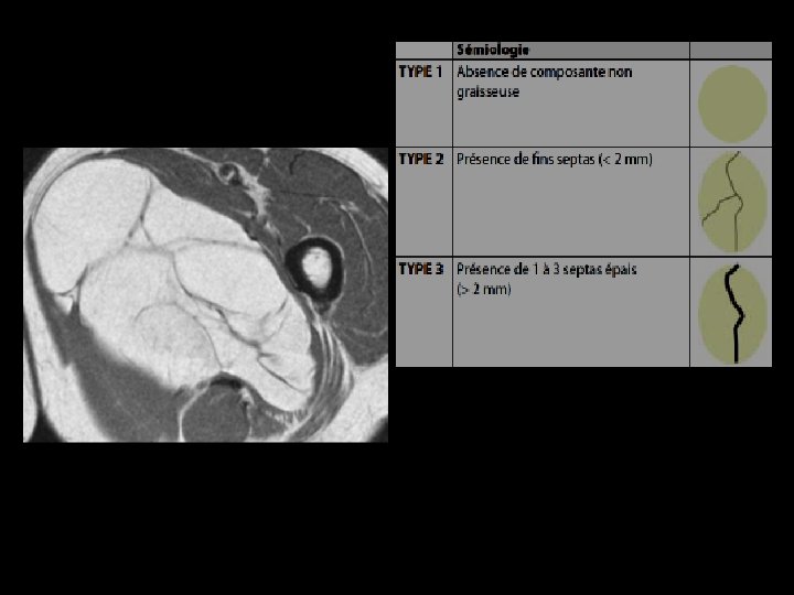IRM : Cas particuliers • Capsule fibreuse en hyposignal sur l'ensemble des séquences • Fins septa réguliers conjonctivo-vasculaires, toujours d'épaisseur inférieure à 2 mm coupe axiale pondérée en. T 2 : visualisation de fins septa (flèches) au sein de la masse graisseuse homogène et en hypersignal