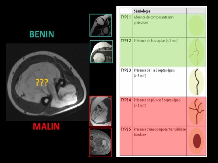 TUMEURS GRAISSEUSES BENIGNES LIPOME Localisation superficielle Taille < 5 cm Homogène Sépta < 2 mm Pas de nodules MALIGNES LIPOSARCOME BIEN DIFFERENCIE Localisation sous aponévrotique Taille >5 cm Hétérogène Sépta épais Éléments nodulaires et tissulaires