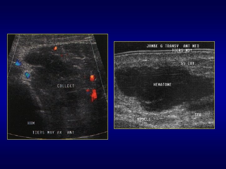 Masse des parties molles: échographie • En seconde intention après radiographie • Démarche diagnostic en échographie - est-ce vraiment un processus expansif? - processus unique ou multiple? - lésion liquide ou solide? - localisation exacte, envahissement? - caractéristiques vasculaires?
