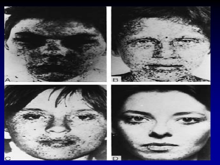 Diagnostic Criteria for Carney Complex * Clinical Criteria 1. Spotty skin pigmentation with typical distribution (lips, conjunctiva and inner or outer canthi , vaginal and penile mucosa) 1. Spotty skin pigmentation with typical distribution (lips, conjunctiva and inner or outer canthi, vaginal and penile mucosa) 2. Myxoma (cutaneous and 2. Myxoma ( and mucosal) 3. Cardiac myxoma 4. Breast myxomatosis or fat-suppressed MRI findings suggestive of this diagnosis 5. Primary pigmented nodular adrenocortical disease or paradoxical positive response of urinary glucocorticosteroids to 5. Primary pigmented nodular adrenocortical disease or paradoxical positive response of urinary dexamethasone administration during Liddle's test dexamethasone administration during Liddle's 6. Acromegaly due to growth hormone-producing adenoma 7. Large cell calcifying Sertoli cell tumors or characteristic calcification on testicular ultrasonography 7. Large cell calcifying Sertoli cell 8. Thyroid carcinoma or multiple, hyperechoic nodules on thyroid ultrasonography, in a young patient 8. Thyroid carcinoma or multiple, hyperechoic nodules on thyroid 9. Psammomatous melanotic schwannoma 10. Bule nevus, epithelioid blue nevus (multiple) 10. Bule nevus, 11. Breast multiple)) 11. Breast ductal adenoma (multiple 12. Osteochondromyxoma Supplemental Genetic Criteria 1. Affected first-degree relative 2. Inactivating mutation of the PRKAR 1 α gene 2. Inactivating mutation of the PRKAR 1α