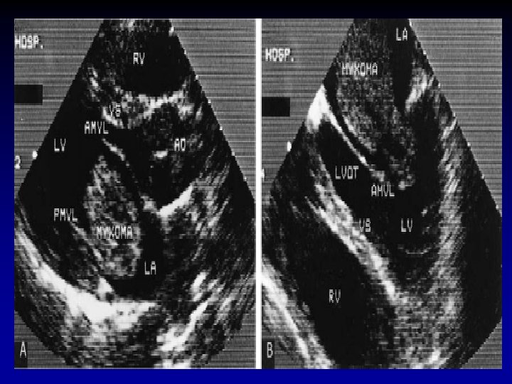 TUMORES BENIGNOS MIXOMA AURICULAR • Rx • 50% tienen AI grande y signos de HTP • 30% Rx normales • Ecocardiografía • Diagnóstico • Identificar sitio de unión del tumor • Descartar compromiso valvular • Descartar masas múltiples • Planear cirugía • Control Pos. Qx