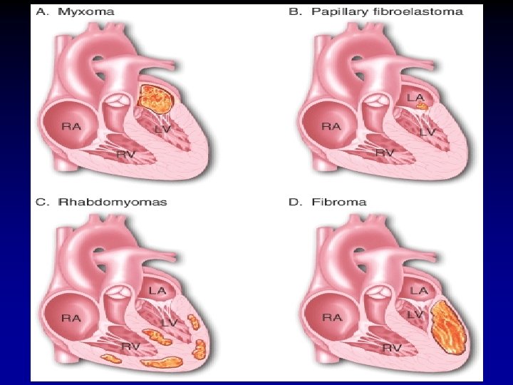 Symptoms and Signs of Cardiac Myxoma * Variable Symptoms Incidence (%) Dyspnea 70 Paroxysmal dyspnea 25 Syncope 20 Palpitations 20 Chest pain 10 Embolic event 30 Fever 20 Weight loss 15 Signs Mitral systolic murmur 50 Mitral diastolic murmur 40 Loud S 1 40 Tumor plop 15 Laboratory Data Elevated ESR 30 Anemia 30 LA enlargement on CXR 10