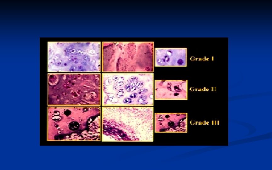 CONDROSSARCOMA - - Comportamento bastante variável: Alguns crescem rapidamente, invadem agressivamente tecido normal, fazem metástases e causam morte do pcte; Muitos outros crescem lentamente, causam poucos danos a tecidos adjacentes e fazem metástases depois de muitos anos ou nem chegam a fazê-las