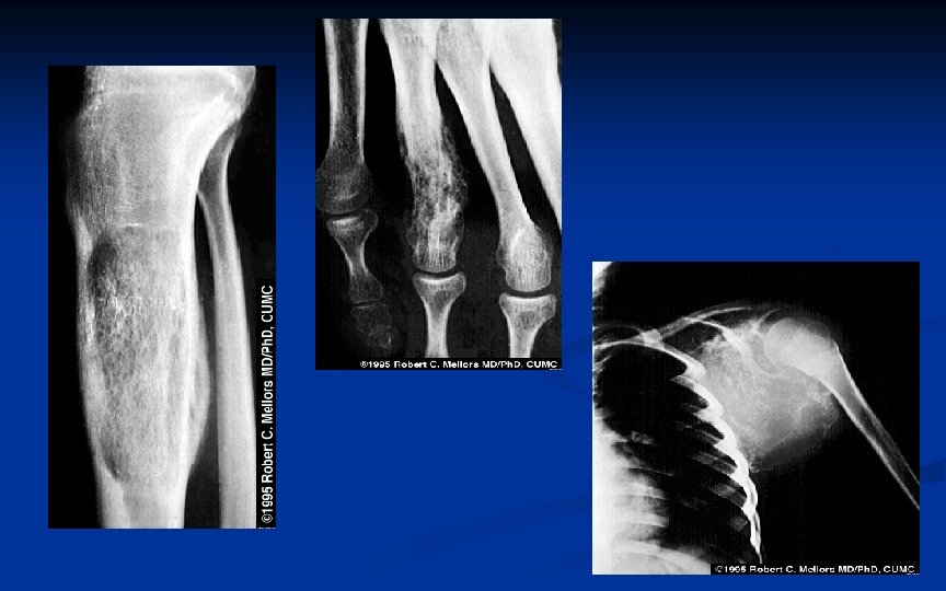 OSTEOSSARCOMA • Metástases pulmonares ocorrem precocemente – freqüentemente o fazem dentro de 2 anos após o diagnóstico