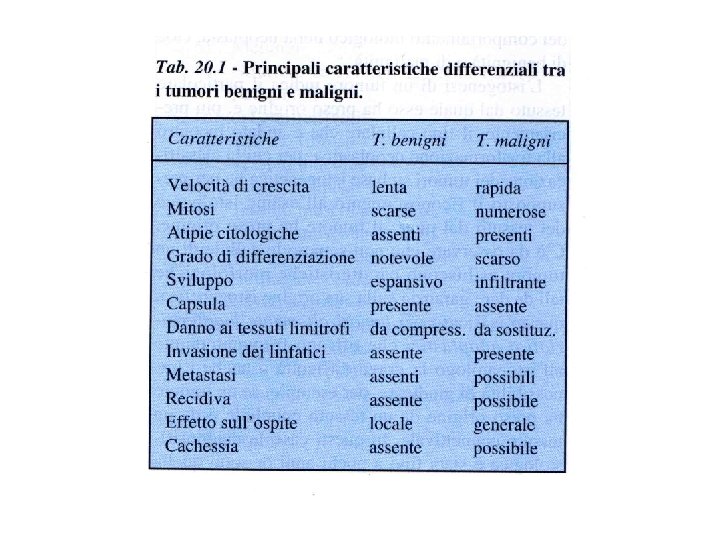 Classificazione in base al comportamento biologico In riferimento alle caratteristiche morfologiche delle cellule ed alle modalità di accrescimento e comportamento nei riguardi dei tessuti limitrofi e all’interno dell’organismo vengono suddivisi in: Benigni Maligni Ben differenziato. Il tessuto di origine è ben riconoscibile La struttura del tessuto di origine è perduta in vario grado così come il differenziamento delle singole celluleanaplasia. Pleiomorfismo cellulare: forma e dimensioni non uniformi. Aumento dimensioni generalmente con una certa regolarità fino ad arrivare ad uno stadio limite o regredire. Mitosi rare e normali. Irregolare. Può essere lenta e poi improvvisamente rapida. Mitosi numerose e con forme abnormi Espansiva e invasiva. La massa tumorale è compatta. Comprimono i tessuti vicini senza infiltrarli. Non invasivo. Spesso incapsulati Lassi e senza capsula. Compressione. Sintomi da iperfunzione Distruzione dei tessuti per infiltrazione; disseminazione metastatica; cachessia. Non recidivano se asportati bene. Non mortali. Possono recidivare. Mortali se non curati Invasiva a livello locale e a distanzametastasi.
