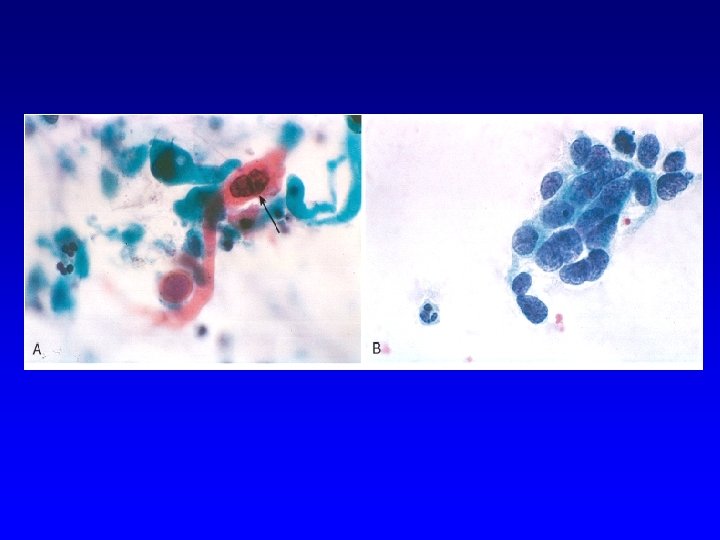 Classification of brochogenic carcinoma Differences between SCLC and NSCLC: Histology Small cell lung carcinoma: Scant cytoplasm; small, hyperchromatic nuclei with fine chromatin pattern; nucleoli indistinct; diffuse sheets of cells Non- Small cell lung ca: Abundant cytoplasm; pleomorphic nuclei with coarse chromatin pattern; nucleoli often prominent; glandular or squamous architecture