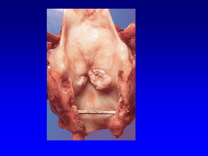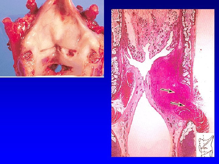 Laryngeal tumors Vocal cord nodules • Less than 0. 5 cm. in diameter located on the true vocal cords. • Composed of fibrous tissue and covered by stratified squamous mucosa. • Occur in heavy smokers or singers. Laryngeal papilloma • Benign neoplasm on the true vocal cords. • Histologically, it consists of multiple, slender, finger-like projections supported by central fibrovascular cores covered by stratified squamous epithelium. • Juvenile laryngeal papillomatosis. – Caused by human papillomavirus types 6 and 11. – Tend to recur after excision