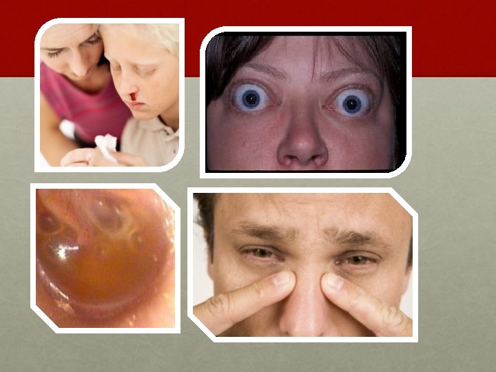 CLINICAL FEATURES: § Profuse and recurrent epistaxis. § Progressive nasal obstruction and hyponasal voice. § Conductive hear loss and middle ear effusion. § Extension of tumor in different directions produces symptoms like facial swelling, proptosis, diplopia, broadening of nasal bridge, palatal buldge and cranial nerve palsies.