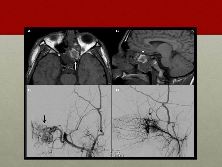 • ANGIOGRAPHY: • Carotid or four vessel angiography - vascular nature of the tumour, its feeding vessels and extension of the tumour. • In addition during angiography embolization of the feeding vessel with gelfoam can be done pre-operatively to shrink the tumour and reduce bleeding during surgery. • BIOPSY: controversial