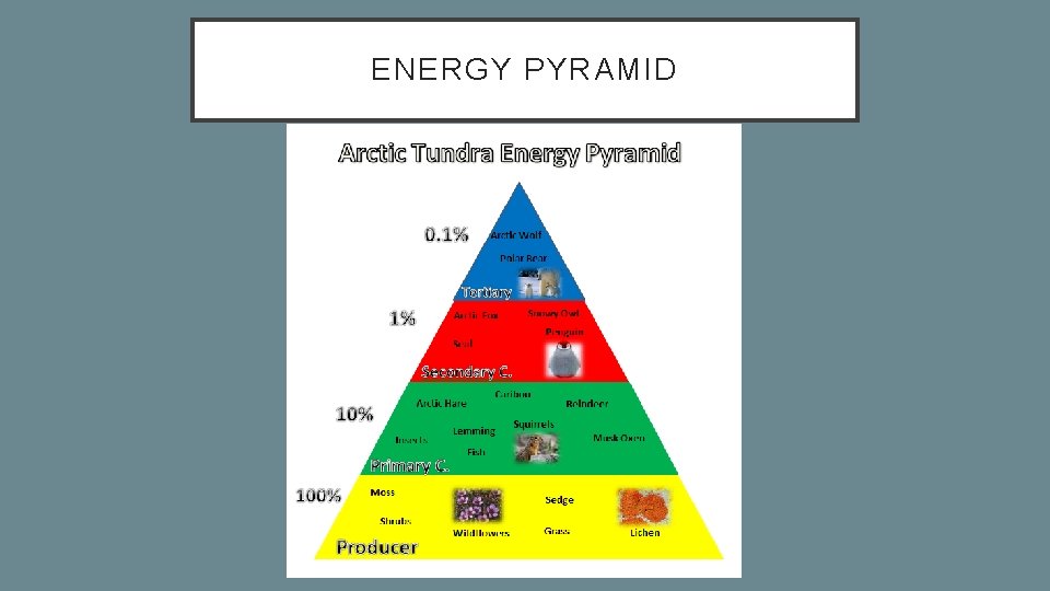 ABIOTIC FACTORS • Temperature severely limits the type of species that can live there due to the harsh cold weather • Winds are severely strong making it difficult for large plant species to inhabit. ( only small shrubby plants vegetate the tundra) • Rainfall in the tundra on average is only 6 -10 in. This also effects the vegetation growing • Permafrost/ soil: layer of soil permanently frozen , if the permafrost melts it alters the temperature and threatens the species living. There’s a top soil that is active and thaws in summer. Provides vegetation. • Nutrients like phosphorous and nitrogen are the major nutrients. The nutrients are cycled and distributed through the plants and animals , eventually returning to the soil