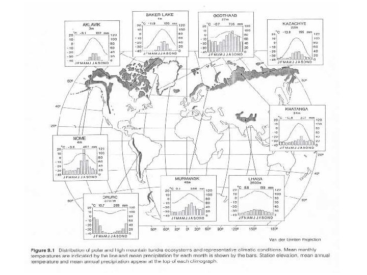 Klima: arktická tundra - ovlivňována masami chladného, suchého polárního vzduchu - oceanický vliv (vyrovnanější klima) se projevuje jen v Grónsku, na Islandu a v severní Skandinávii (hranice tundry severněji). - průměrná roční teplota pod 0 o. C, prům. t nejteplejšího měsíce pod 10 o. C - ale povrch půdy zůstává nad 0 o. C ještě několik týdnů po uhození mrazů - pouze 2 -6 měsíců v roce je t nad 0 o. C, pouze 3 -4 měsíce nad 5 o. C. - srážky pod 250 mm/rok, 60% ve formě sněhu. + neměřitelné horizontální srážky a rosa. Sněhová pokrývka 20 -40 cm, v depresích však až 3 m. - permafrost brání vsakování roztálého sněhu - polární poušť: srážky pod 100 mm/rok, vegetace je v takovém případě omezena na místa, kde se sníh drží až do léta. - v létě je vysoký přísun solární energie (dlouhý den). Střídání světlého léta a tmavé zimy (rozdíl oproti alpinské tundře).