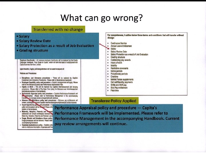 Consequences Capita challenged the incremental pay progression & separate salary increase mechanism post transfer – NOT INCORPORATED INTO CONTRACTS OF EMPLOYMENT � Wanted to apply only performance related pay for progression – virtually impossible for staff to progress to top of grade � UNISON legal advice was bleak � Incorporation of pay & grading into contracts in transferor pre-transfer was unclear Minimal prospect of pursuing breach of contracts claims on that basis Transferee would have strong chance of successful ETO defence based on unforeseen costs of a pay and grading scheme they did not expect to operate Therefore, no realistic chance of a successful legal challenge for us � A new pay & grading scheme based on PRP principles and with lower salary max in each grade had to be negotiated with Capita