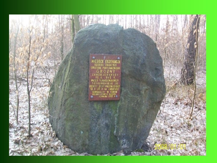 Ze Złotogórskiego Obszaru Chronionego Krajobrazu jedziemy 200 m prosto i znajdujemy się przy głazie upamiętniającym mord na żołnierzach Armii Krajowej.