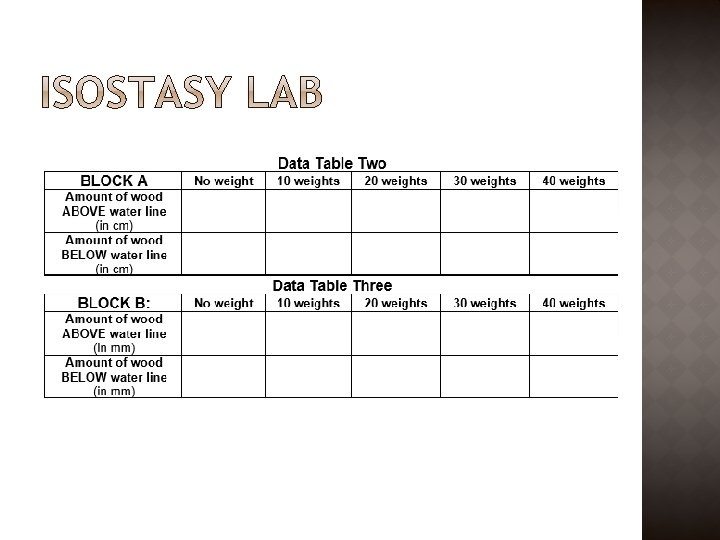 How does density effect isostatic equilibrium? Materials: � 2 blocks of wood of different densities � Weights � Container/water � Metric ruler