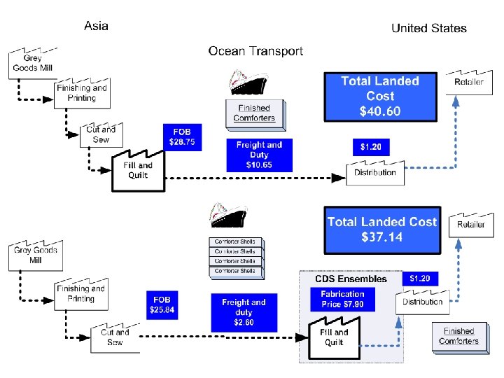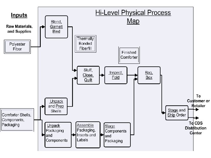 CDS Overview (continued) • Originally - Contract manufacturer for big mills like Dan River, West. Point and Springs – Manufactured all components for Bed in a Bag • Today – Restructured to flexibly integrate into existing and emerging home textile global supply chains – Fill and quilt comforters from imported pre-made shells – Other components cut and sewn in Asia