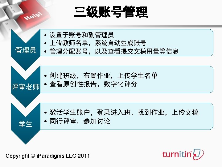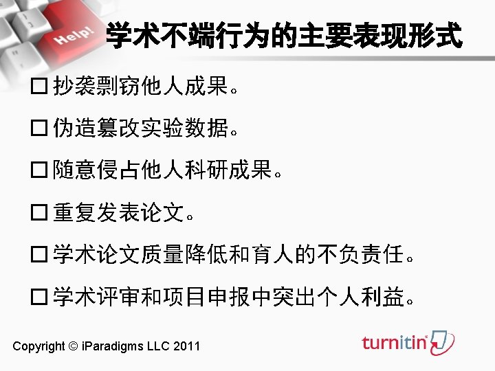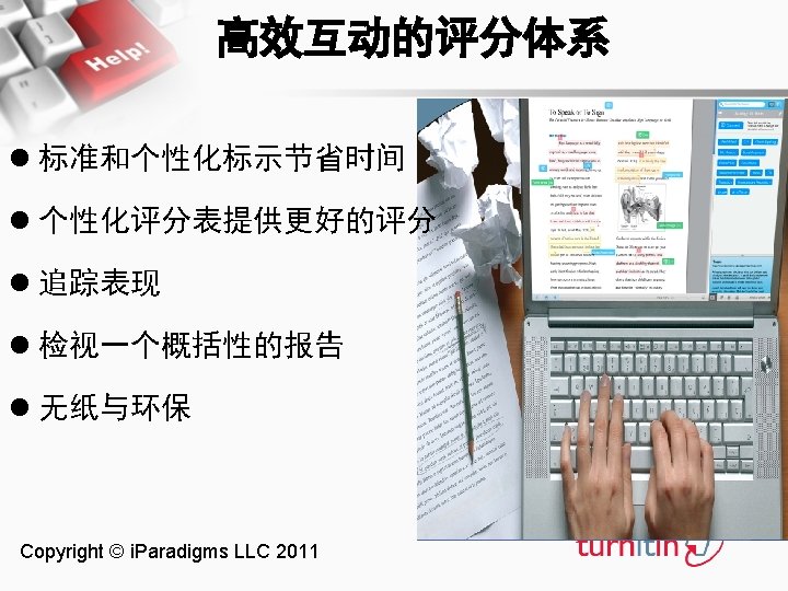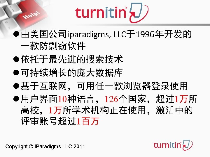 Turnitin Kevin Copyright i Paradigms LLC 2011 Originality Slides: 24 Download presentation Turnitin 为您提供整套的学术写作解决方案 演讲者:Kevin Copyright © i. Paradigms LLC 2011 三大模块 Originality Check 原创性检测 Grade. Mark 数字化评分 Peer. Mark 同行评审 Copyright © i. Paradigms LLC 2011 原创性报告 turnitin Copyright © i. Paradigms LLC 2011 原稿原文浏览 学生的文稿 原稿全文 Copyright © i. Paradigms LLC 2011 三大模块 Originality Check 原创性检测 Grade. Mark 数字化评分 Peer. Mark 同行评审 Copyright © i. Paradigms LLC 2011 可拖拽的评语标示 Copyright © i. Paradigms LLC 2011 三大模块 Originality Check 原创性检测 Grade. Mark 数字化评分 Peer. Mark 同行评审 Copyright © i. Paradigms LLC 2011 谢谢! 微博:http: //weibo. com/turnitin 邮箱:kevin@igroup. com. cn