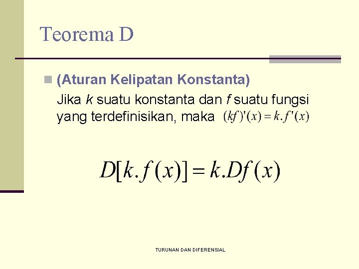 Teorema D n (Aturan Kelipatan Konstanta) Jika k suatu konstanta dan f suatu fungsi yang terdefinisikan, maka TURUNAN DIFERENSIAL
