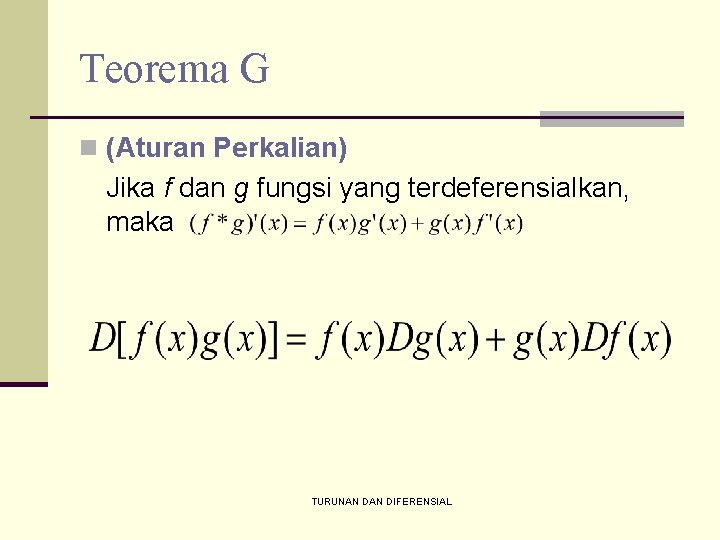 Teorema G n (Aturan Perkalian) Jika f dan g fungsi yang terdeferensialkan, maka TURUNAN DIFERENSIAL