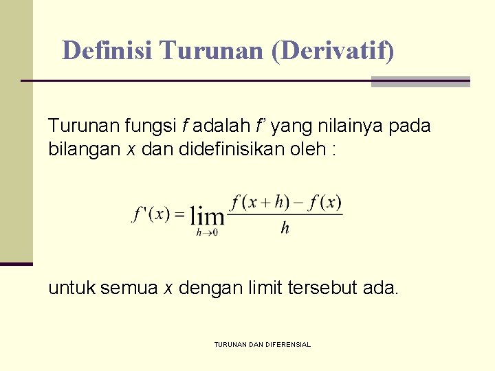 Definisi Turunan (Derivatif) Turunan fungsi f adalah f’ yang nilainya pada bilangan x dan didefinisikan oleh : untuk semua x dengan limit tersebut ada. TURUNAN DIFERENSIAL